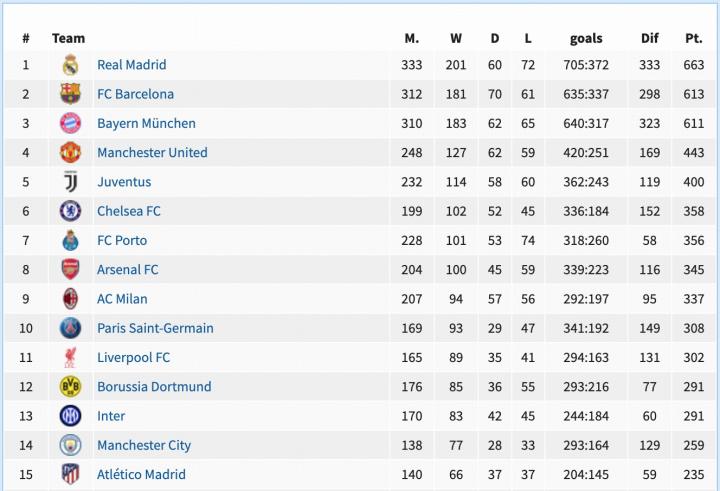 而在这份欧冠战绩榜单上,位列第15的是马德里竞技,这支床单军团6次挺进半决赛,3次进入决赛,却始终未能夺冠。
